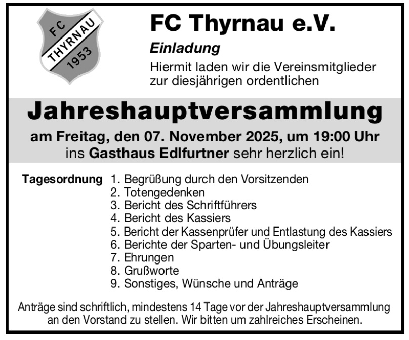 Am 08. September 2025 wurde im Vereinsheim des FC Thyrnau der Förderverein „Freunde und Förderer des FC Thyrnau“ gegründet.